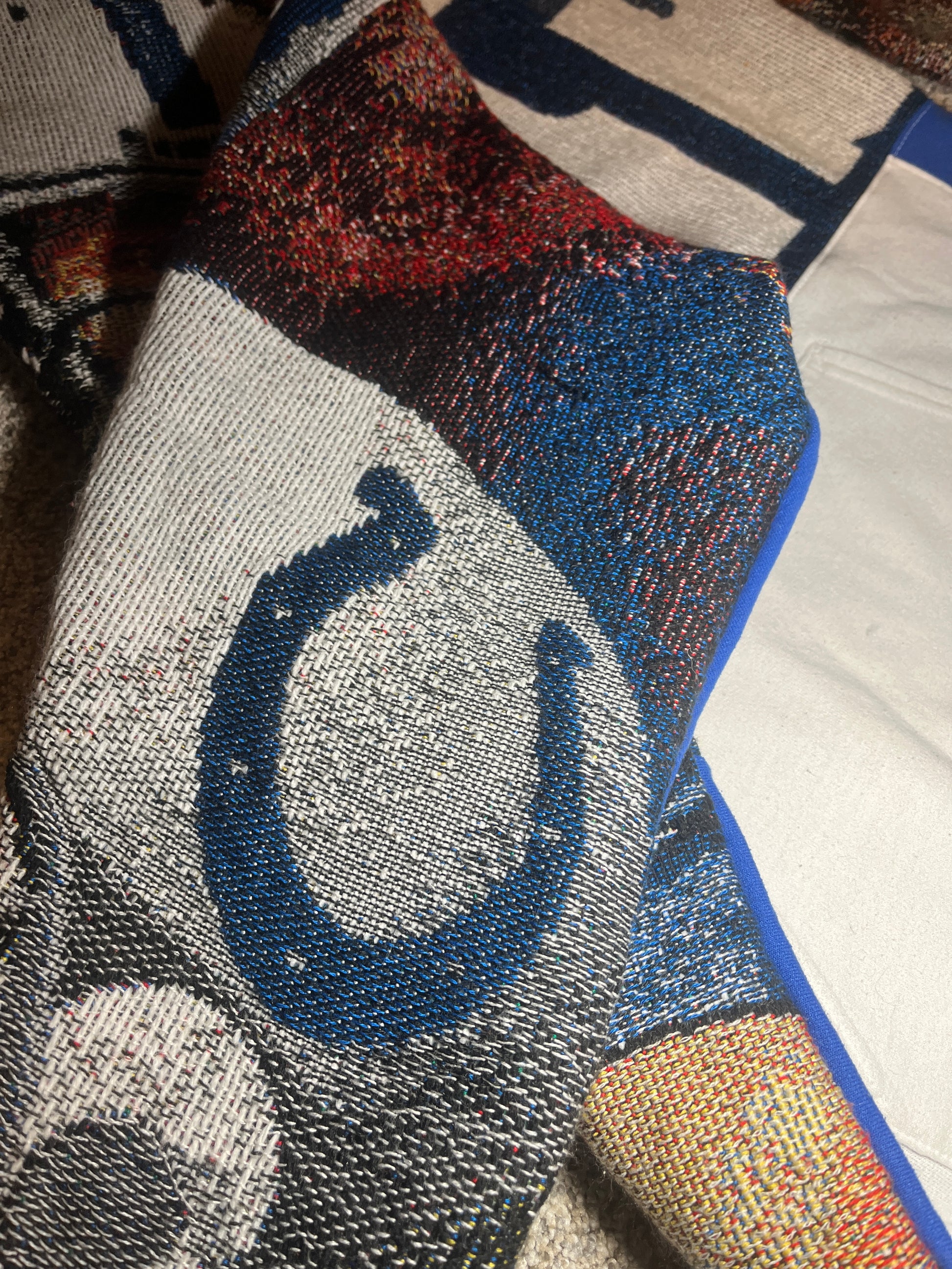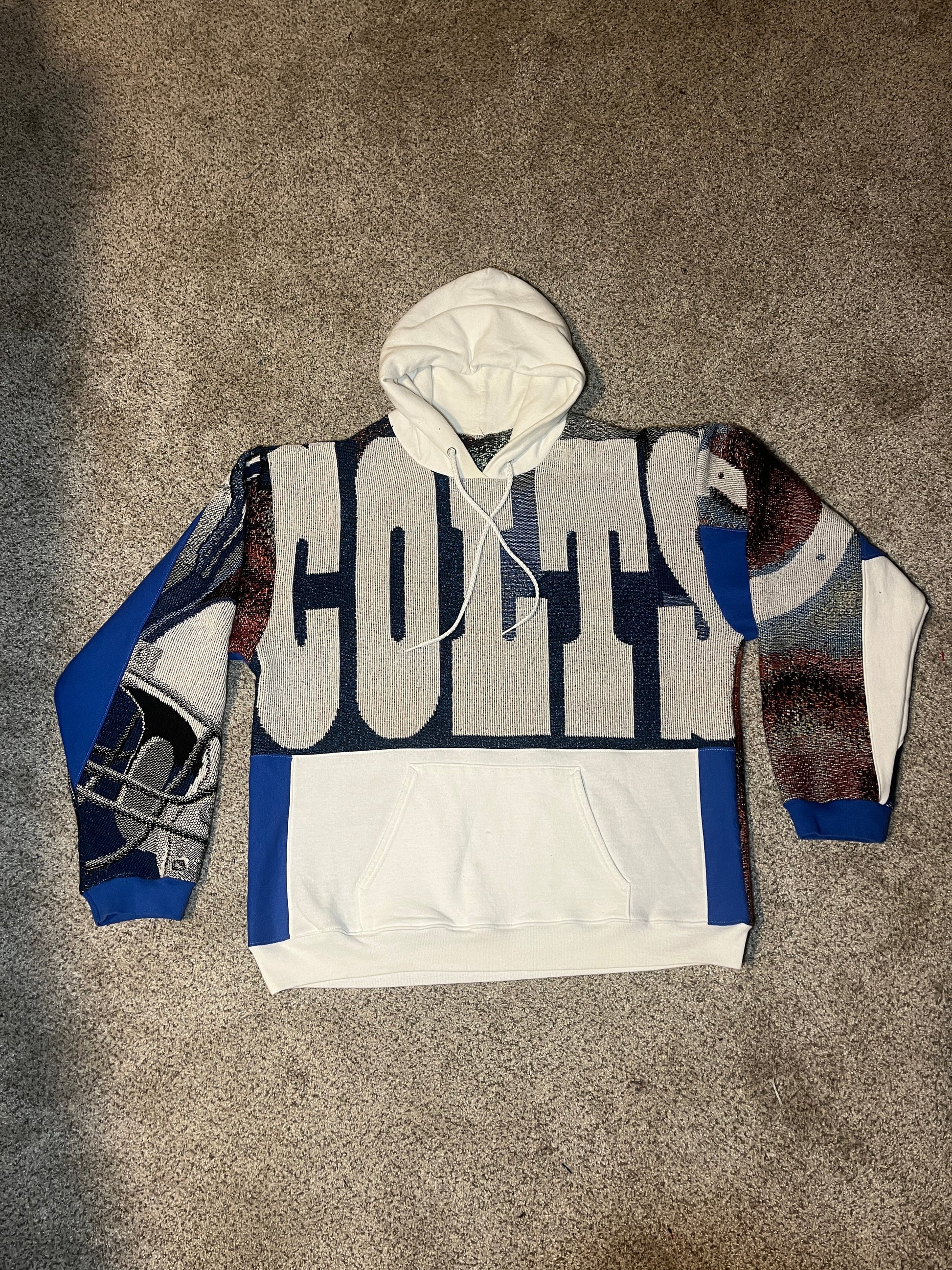 These one-of-a-kind hoodies are cut and sewn from authentic 2000s woven tapestries featuring elite quarterbacks: Tom Brady, Brett Favre, and Peyton Manning. Each hoodie is completely unique—only three exist, one per player.
