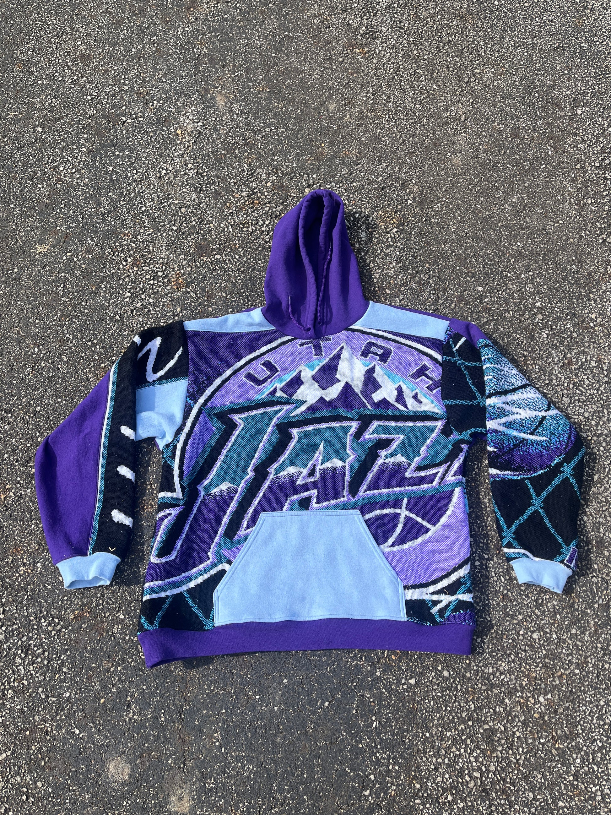 Transform vintage Utah Jazz tapestry into wearable art with this one-of-a-kind reworked hoodie. Crafted from authentic acrylic tapestry material, each piece celebrates basketball nostalgia while delivering comfort and unique style. Perfect for collectors and Jazz fans seeking statement pieces that blend retro charm with contemporary fashion. No two hoodies are identical—wear a piece of sports history.